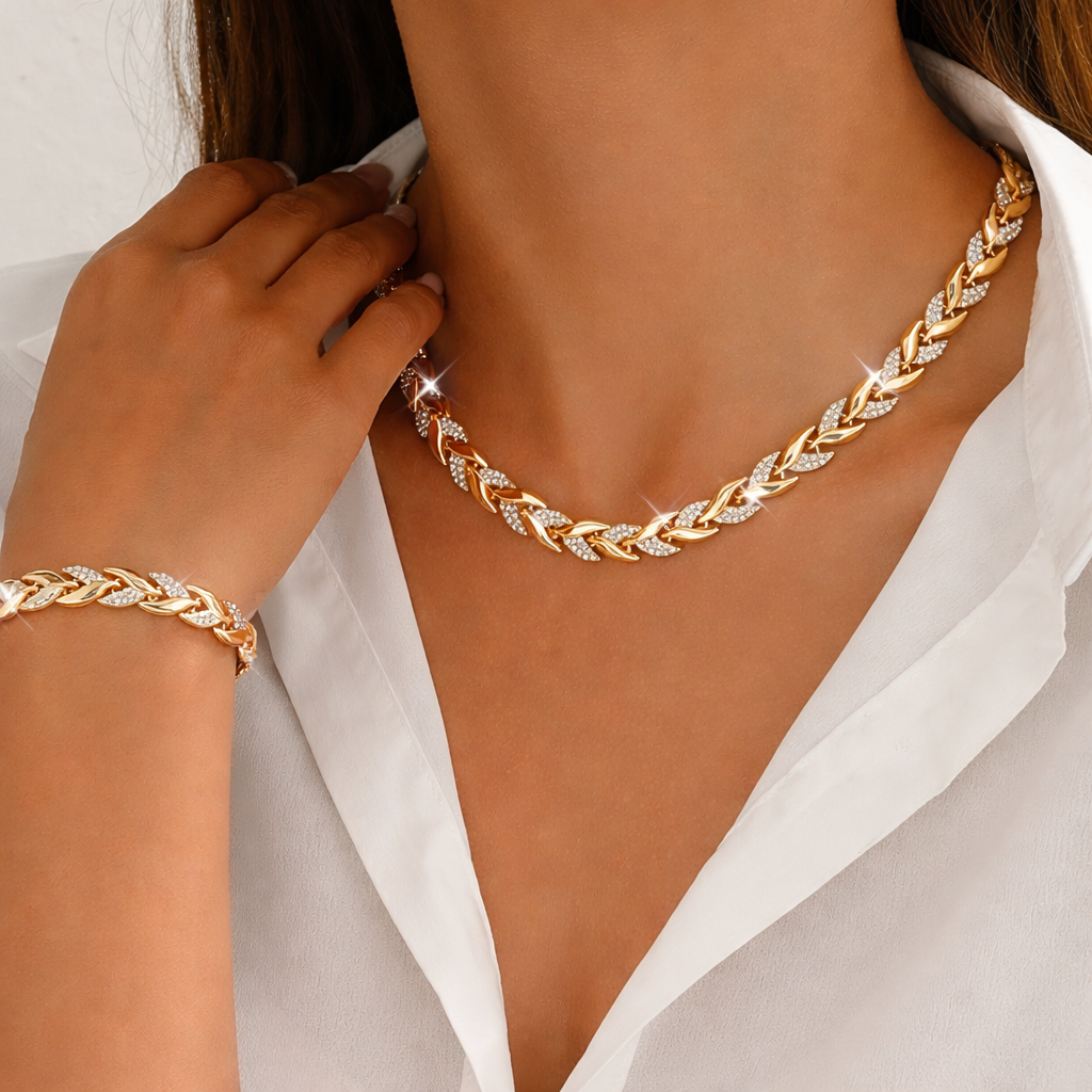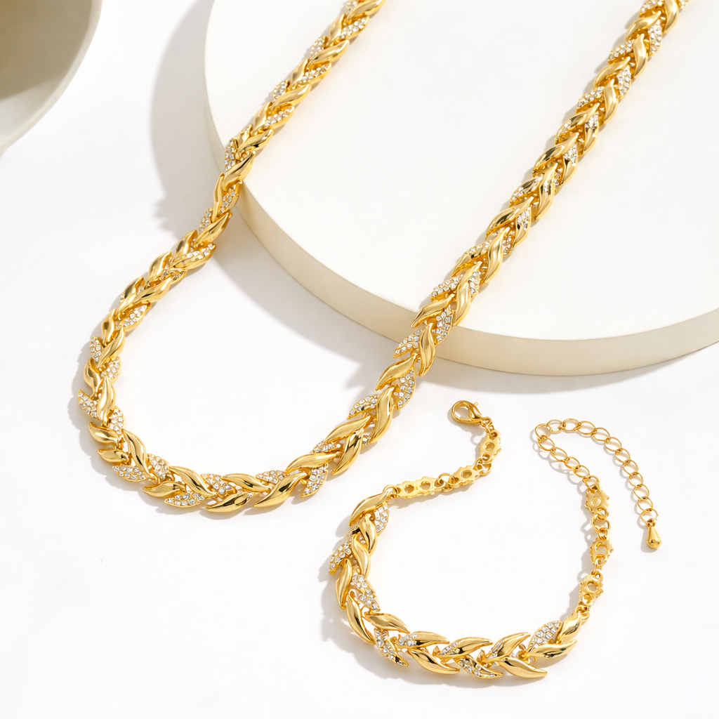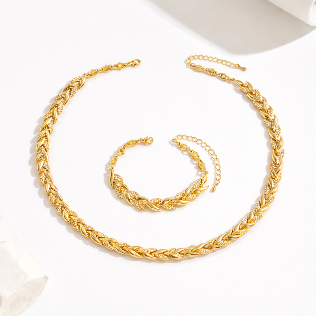 Ten elegancki zestaw składa się zarówno z naszyjnika, jak i bransoletki, zaprojektowanych w pięknym wzorze inspirowanym rybim ogonem, który tworzy luksusowy i harmonijny wyraz.