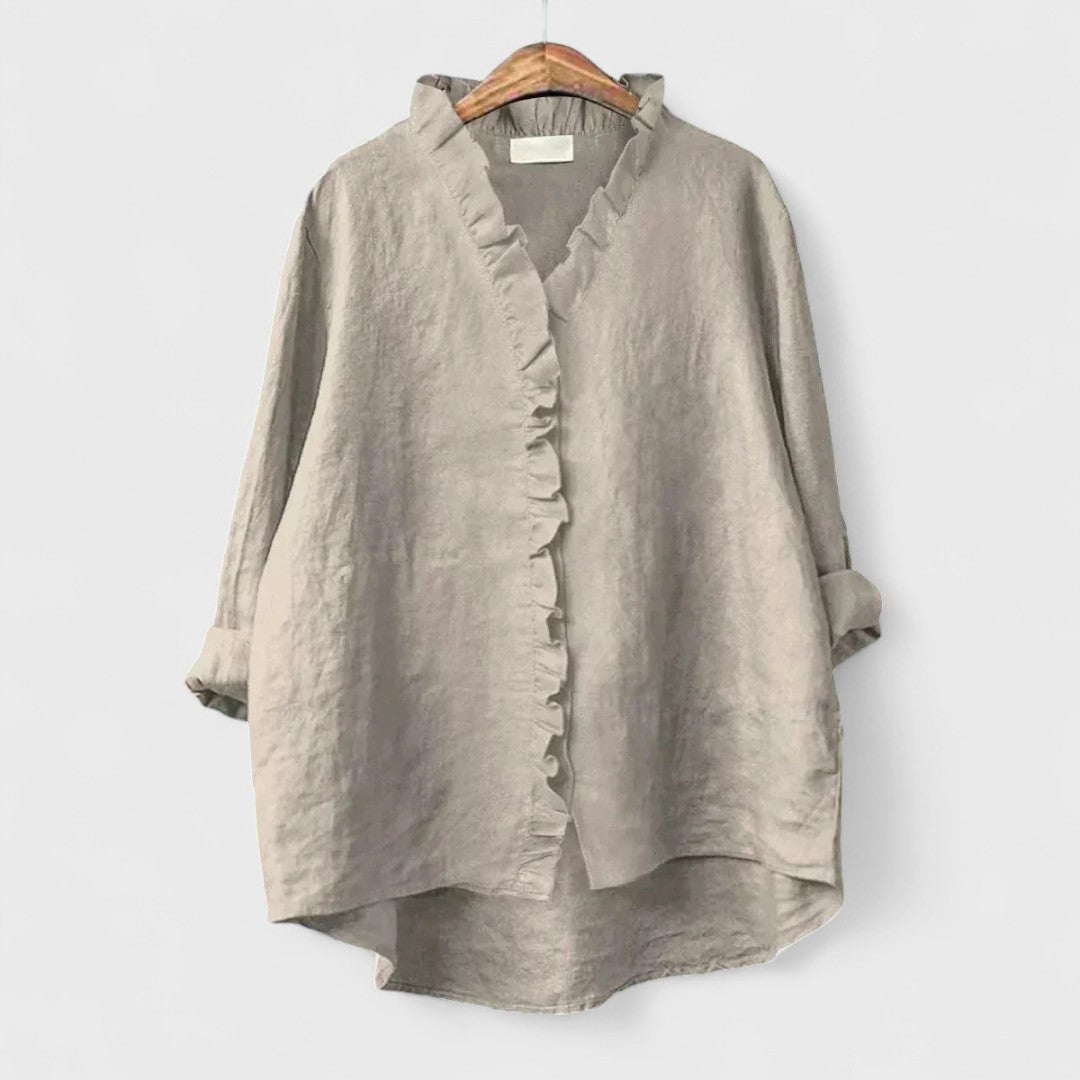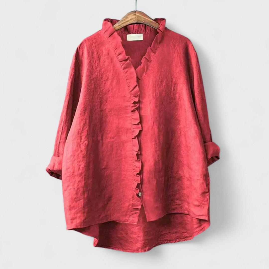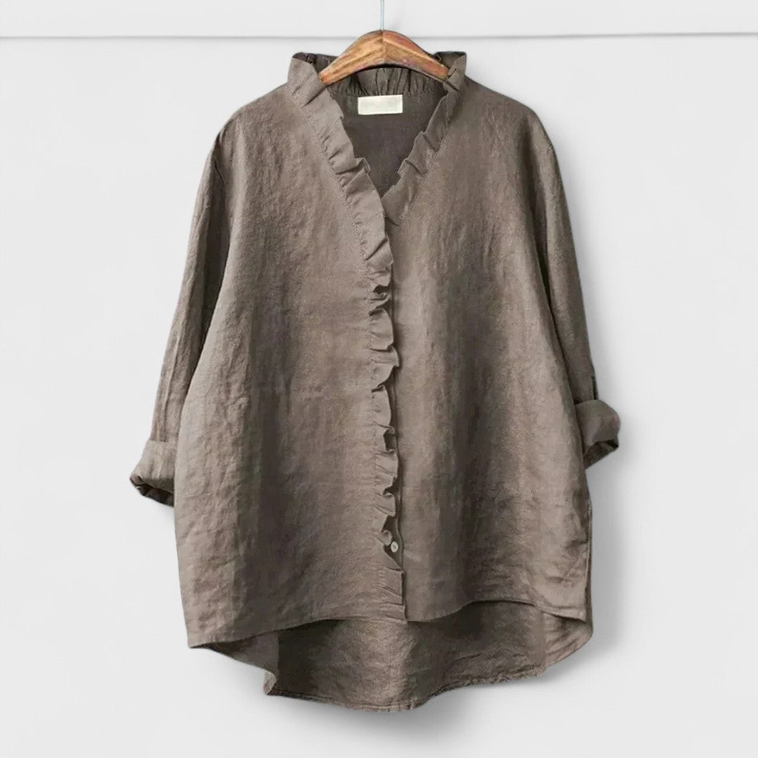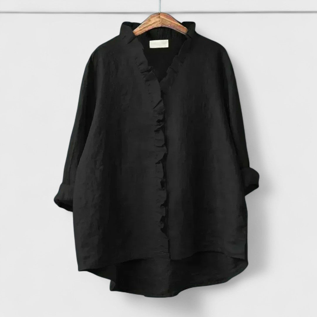 Bluzka Jadwiga to element garderoby, który łączy prostotę i elegancję w jednej swobodnej sylwetce. Jej miękki i lekko rozszerzany krój zapewnia swobodę ruchów, podczas gdy wyrafinowane detale, takie jak kołnierzyk z falbanką i dyskretne guziki, dodają autentycznej kobiecości.