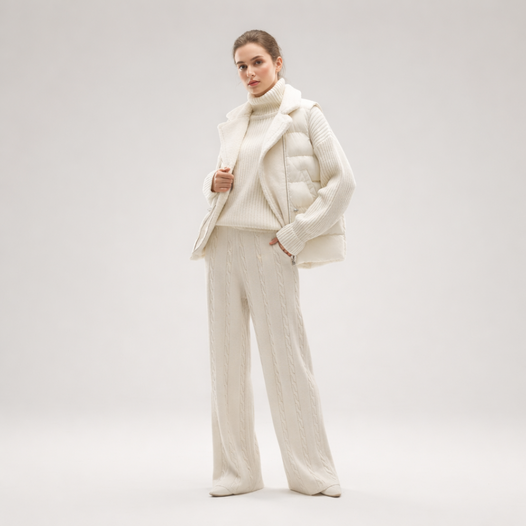 Zanurz się w prawdziwym zimowym luksusie z zestawem Olivia Klein Snug 3-częściowy komplet. Ten całkowicie biały zestaw składa się z przytulnego swetra dzianinowego oraz spodni, idealnie uzupełnionych ciepłą kamizelką. Oferuje nie tylko wyjątkowy komfort, ale także styl i przyjemne ciepło.